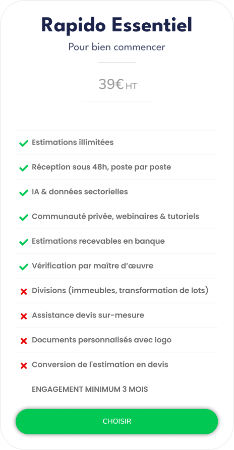 L’offre Rapido Essentiel est conçue pour les professionnels et particuliers cherchant à automatiser leur estimation travaux quotidienne.